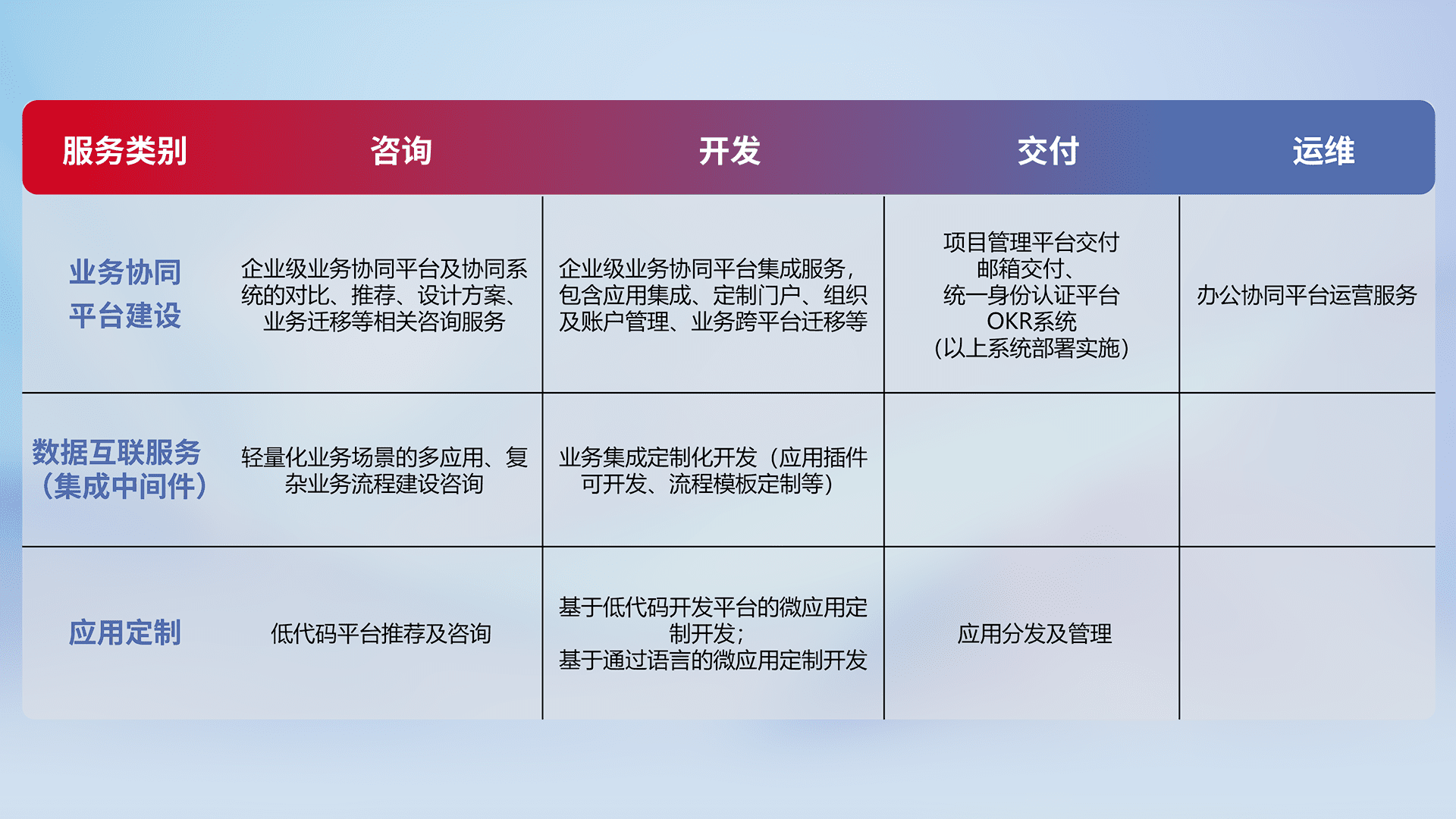 针对钉钉、、企微、、、、IDaas等平台级产品提供产品的规划、、、方案、、、、交付、、定制化开发等服务,,,,实现如统一协同办公、、、智能客户服务、、混合会议管理、、、智能数据查询、、等业务场景,,实现数字化转型。。